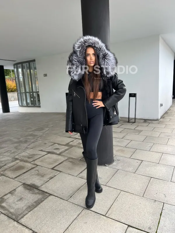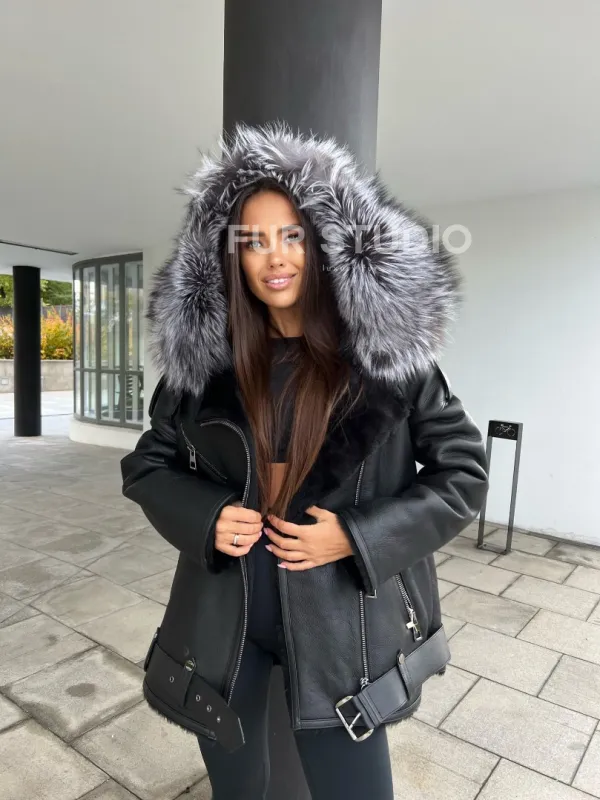 Дубленка - косуха с капюшоном из меха чернобурой лисы 100299