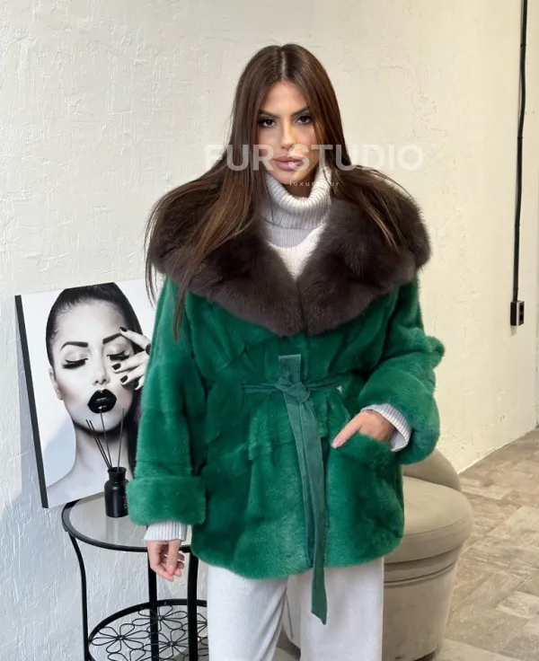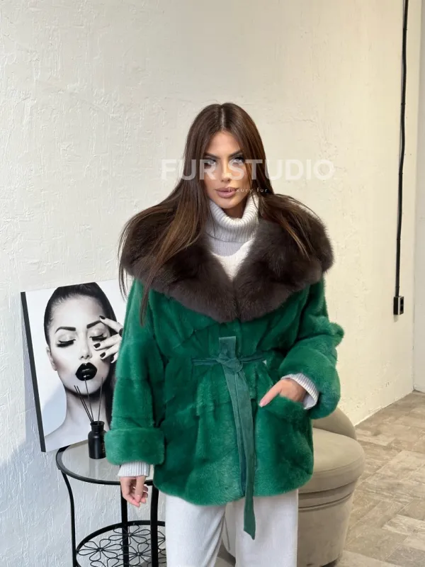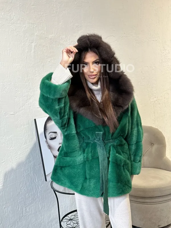 Норковое пончо с капюшоном в цвете изумруд 100329