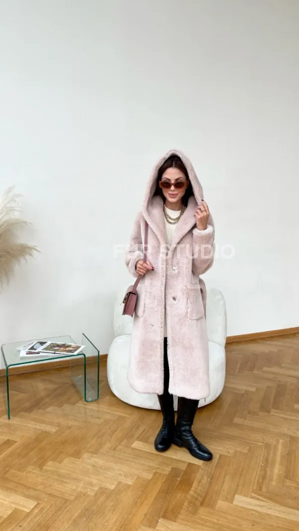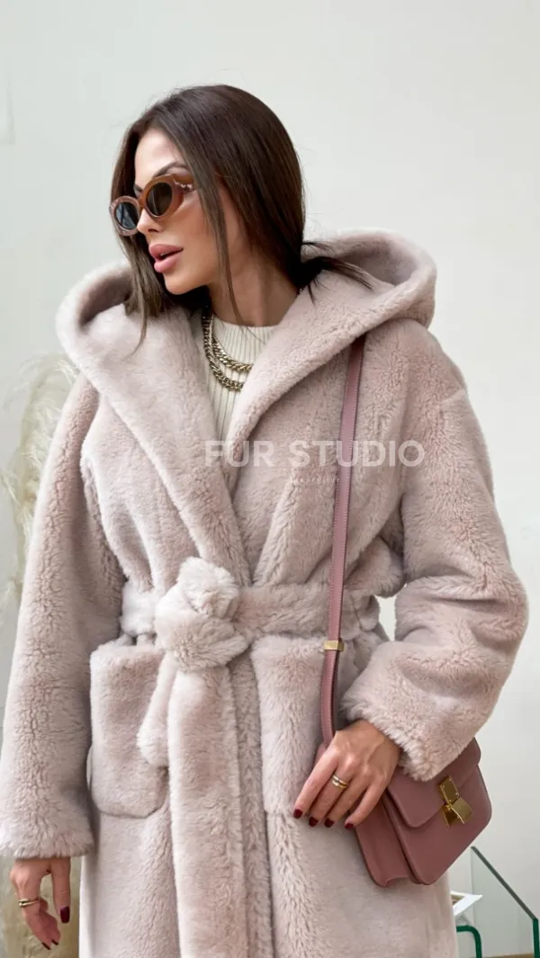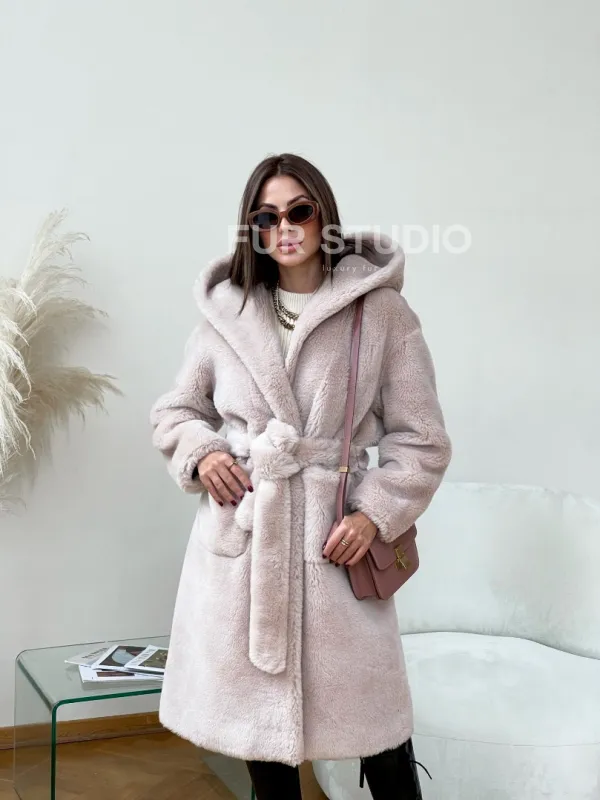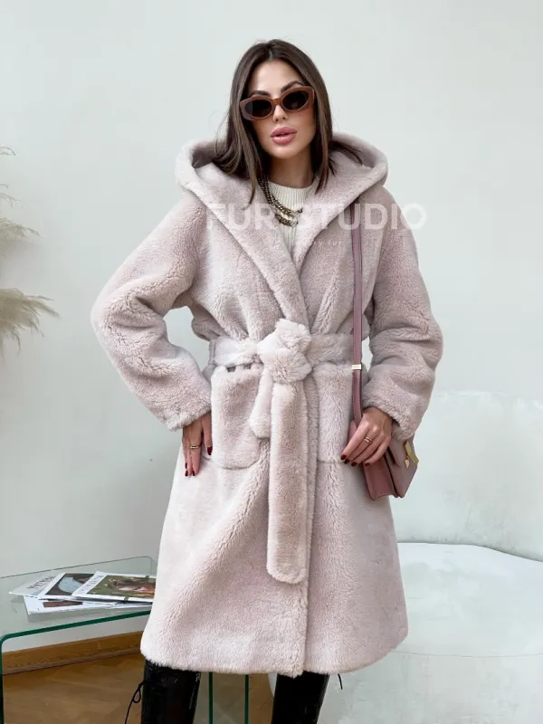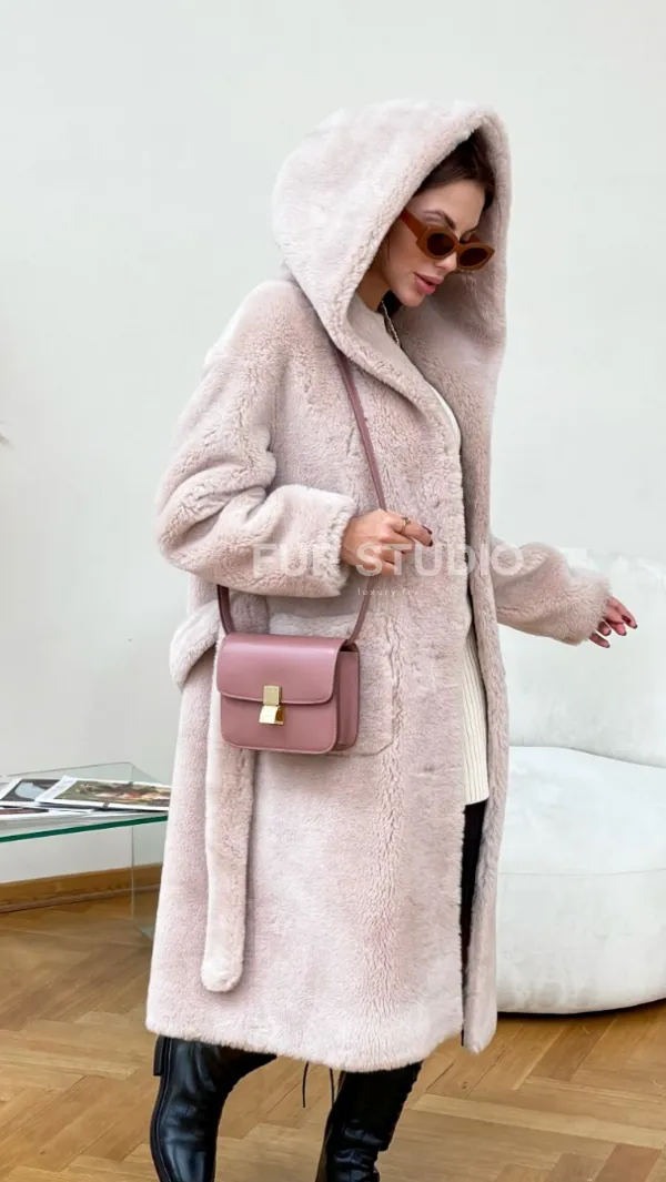 Шуба из натуральной шерсти с капюшоном под пояс 100236