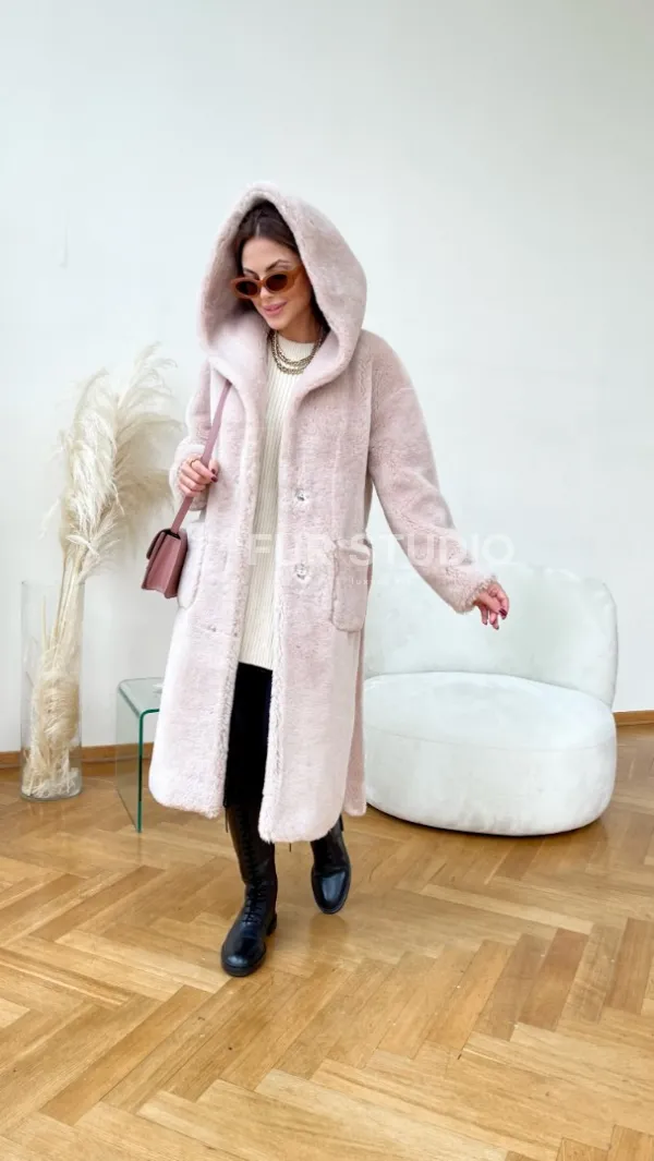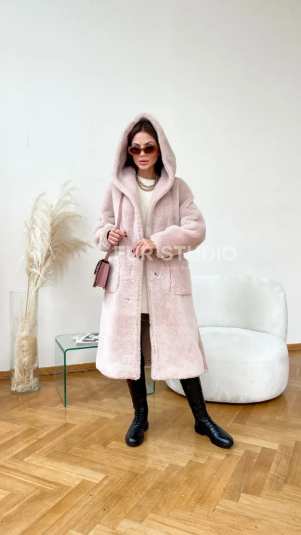 Удобные карманы не дадут замерзнуть ручкам. Нежный цвет придаст образу женственности и гармонии. Добавьте к lookу брендовую сумочку и необычную обувь - вы будете неотразимы. Купить шубу из натуральной шерсти с капюшоном под пояс могут девушки, которые хотят выглядеть изысканно и со вкусом вне зависимости от времени года.